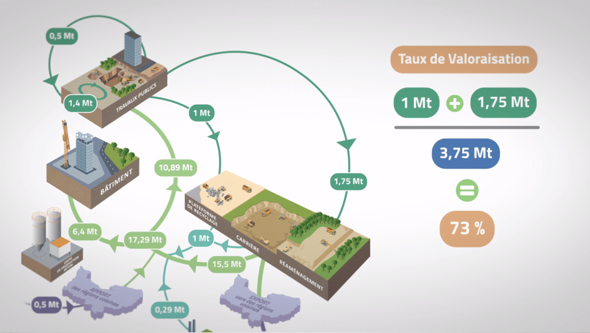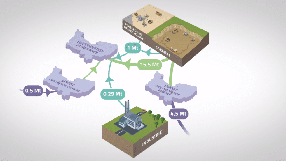 UNICEM Normandie a produit en 2019, un schéma complexe, qui met en lumière l’économie circulaire des matériaux de construction sur son territoire, dont la production de granulat recyclés.