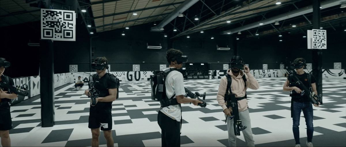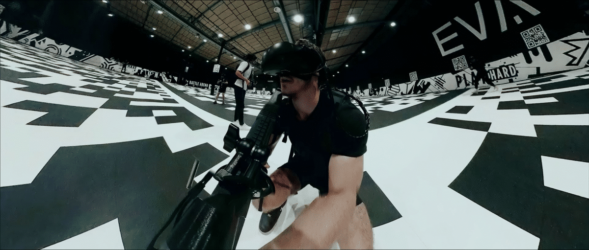 Nous avons tourné avec plusieurs caméras pour filmer des joueurs professionnels lors d’une partie. Nous avons utilisé une caméra 360° accrochée au bout de l’arme d’un joueur pour capturer les déplacements dans l’espace de jeu. Un drone immersif nous a permis de réaliser les plans de l’arène.